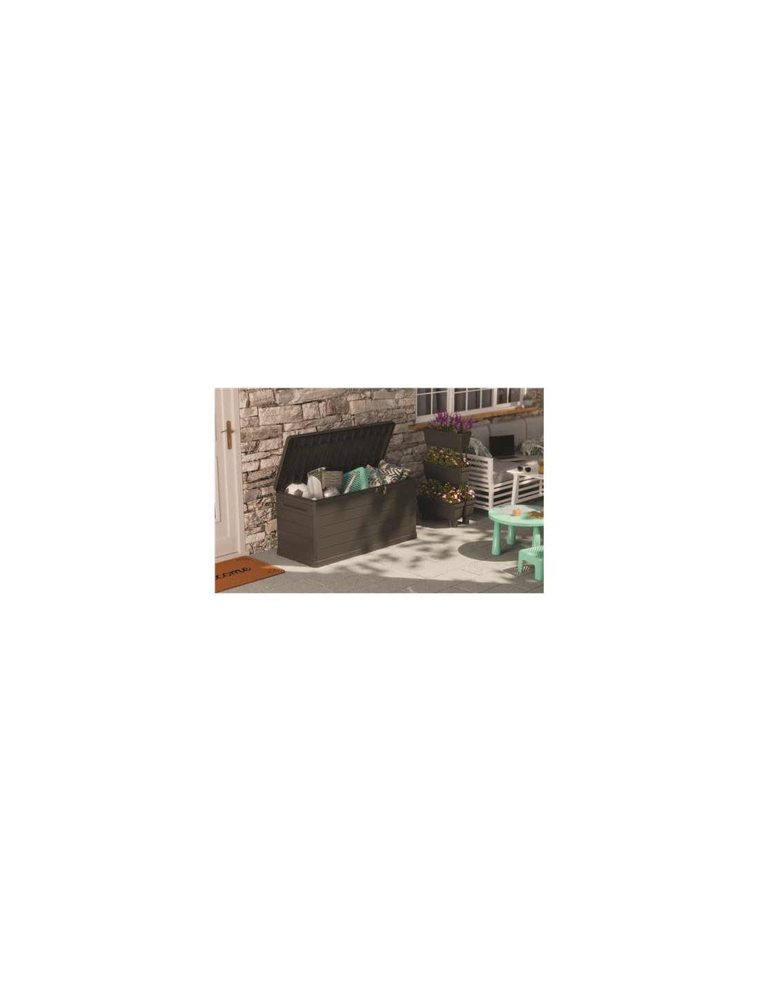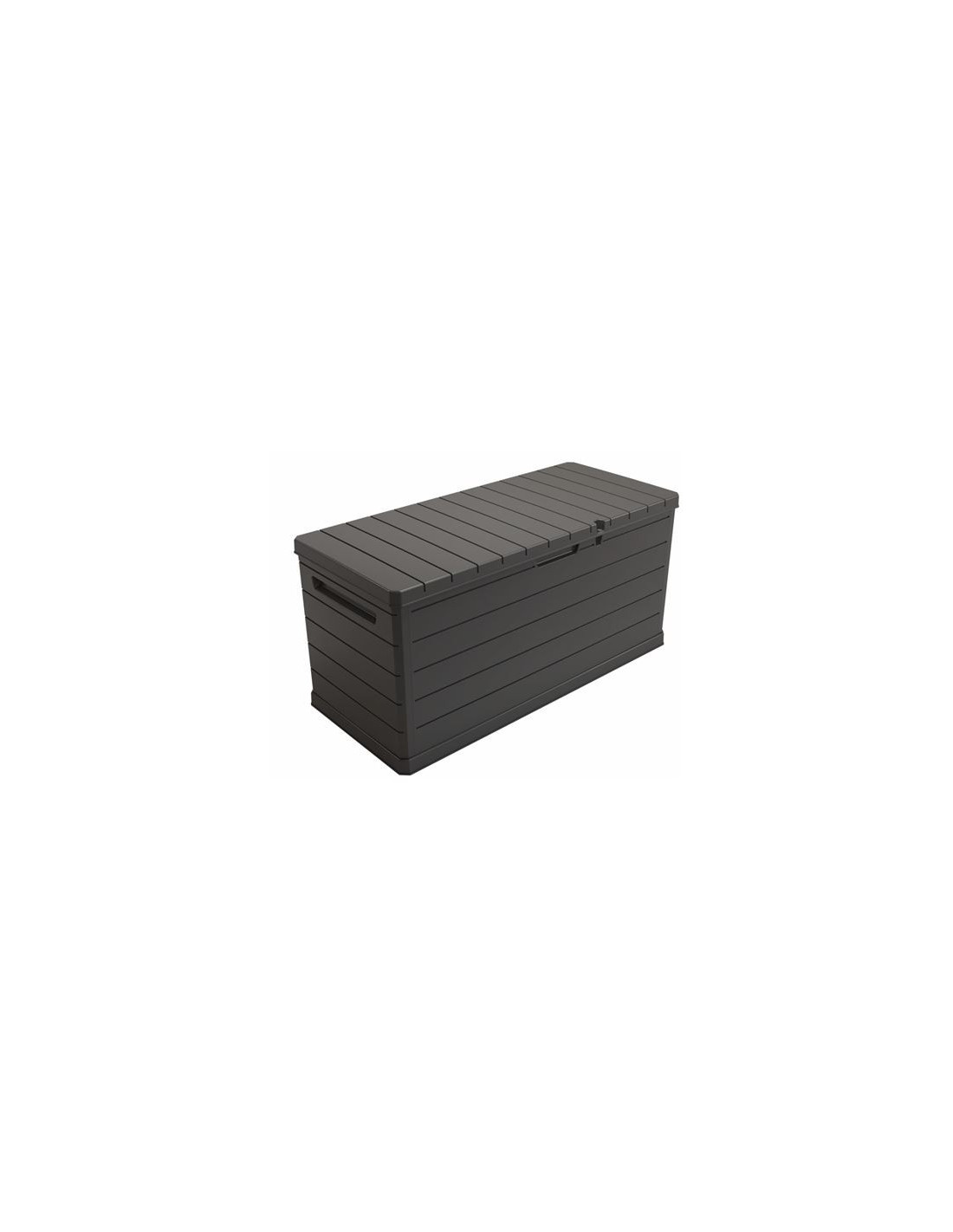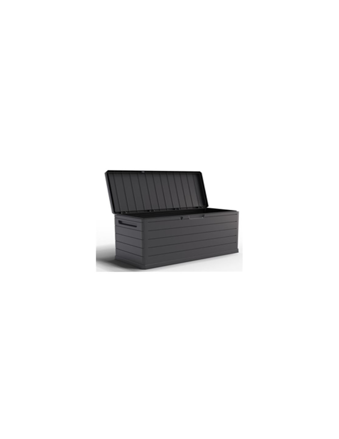 • Baúl de exterior con capacidad de 350 litros, con cerradura (lockable), en color gris oscuro y resistente al agua. Ideal para jardín, terraza o espacios exteriores.