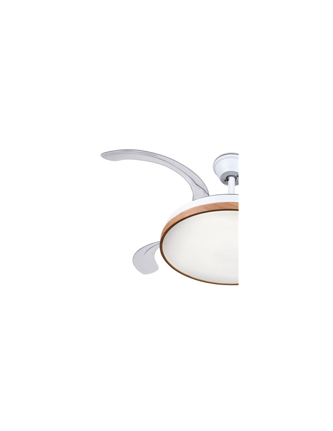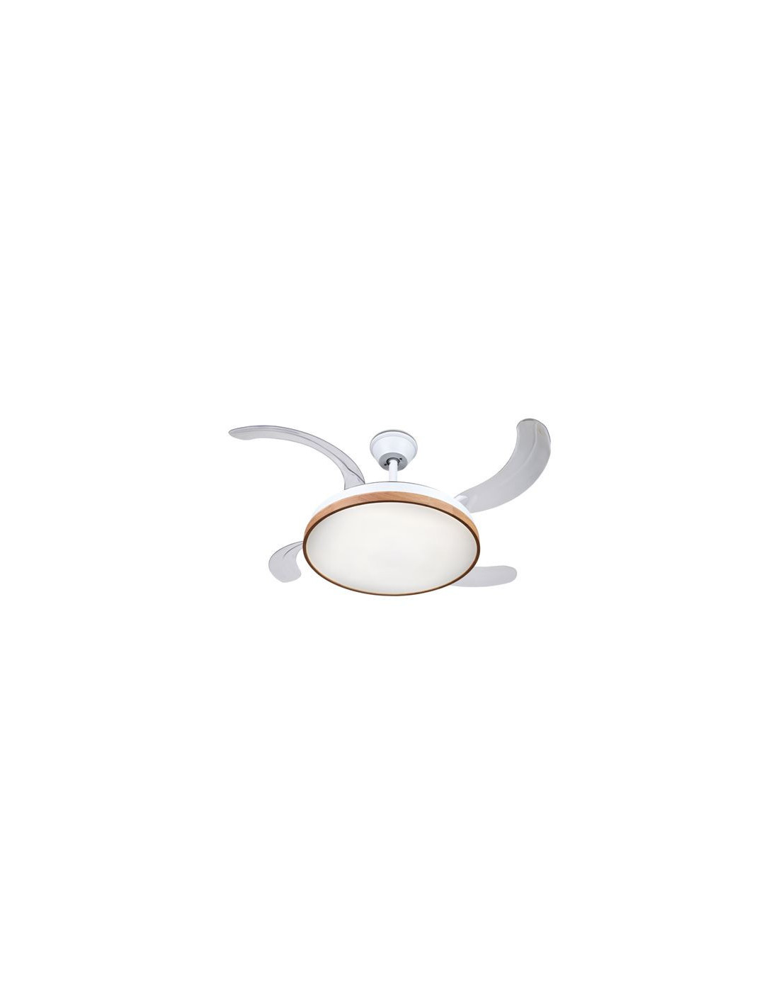 • Sus aspas transparentes se extienden automáticamente cuando está en funcionamiento y se retraen al apagarse, convirtiéndose en una elegante lámpara de techo.