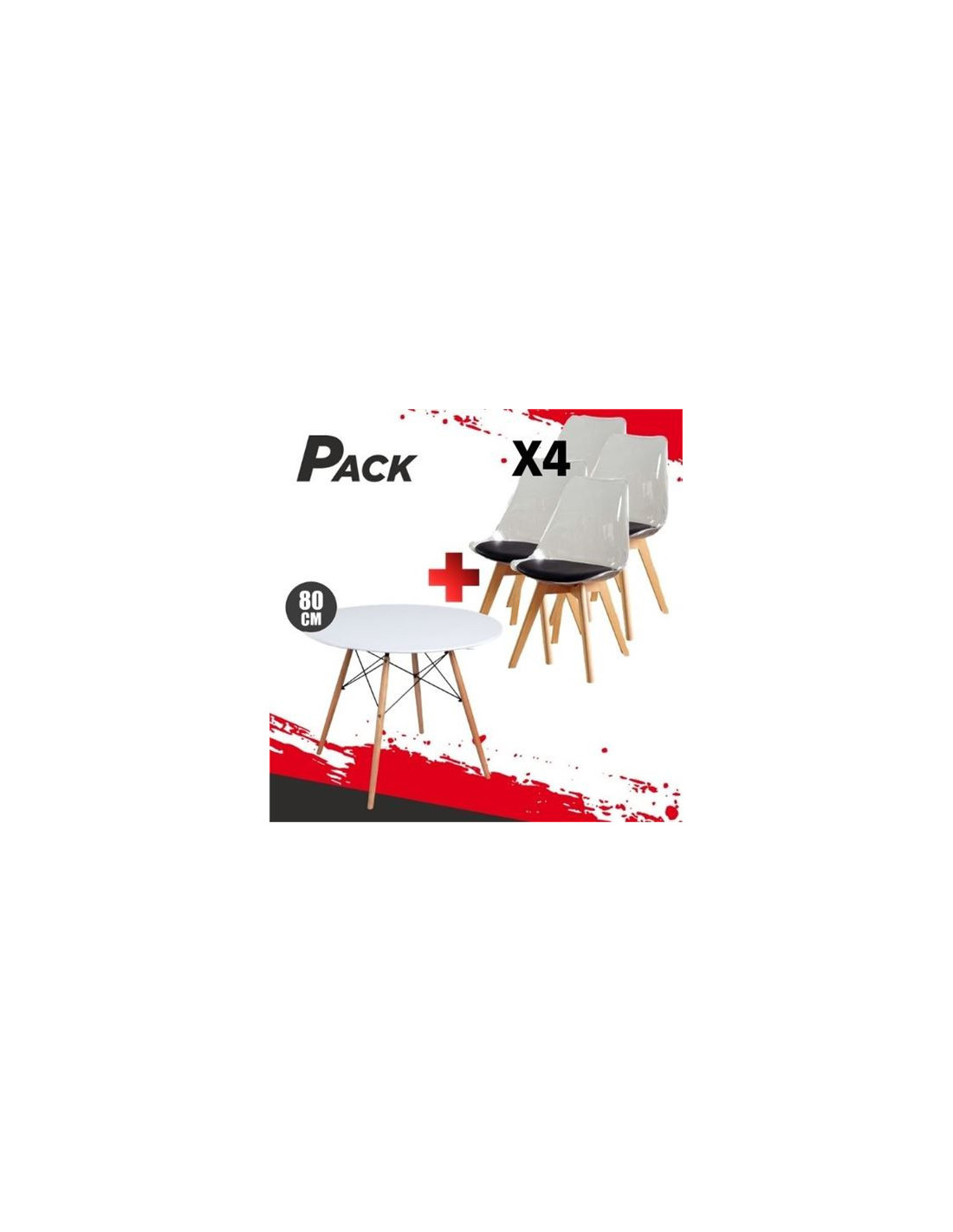 • Pack compuesto por MESA REDONDA DESIGN D500 80CM BLANCA (MV0322) + 4 SILLAS DESIGN D1000 TRANS+NEGRO (MV0609)