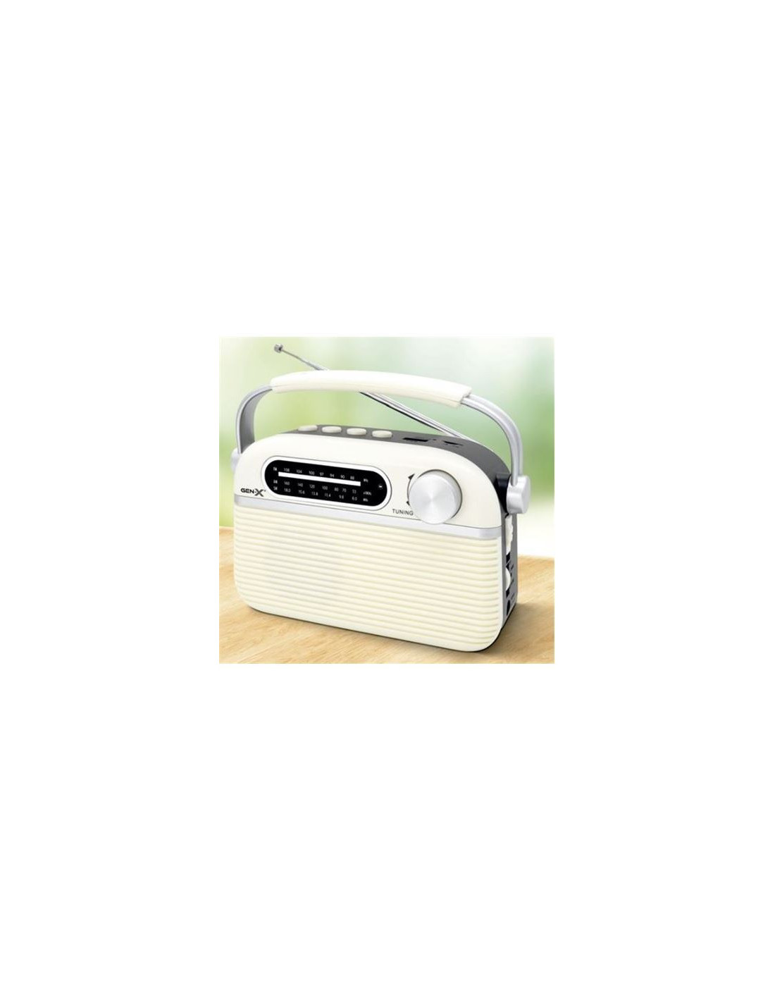 • Radio portátil de estilo clásico con diseño retro y acabados en tonos crema y negro, ideal para uso en interiores o exteriores